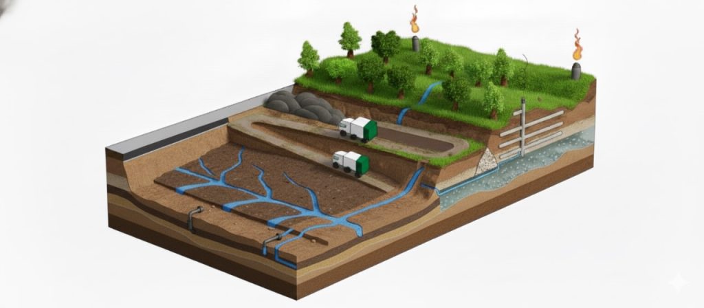 O lixão é o método mais antigo e inadequado de destinação de resíduos. Nele, o lixo é simplesmente despejado no solo, sem nenhum tipo de preparo, tratamento ou controle. Isso significa que todo o material orgânico e químico se mistura diretamente à terra, produzindo chorume, um líquido escuro e tóxico que infiltra no solo e contamina lençóis freáticos, rios e nascentes.